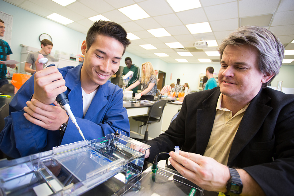 Regents Hall (1985), a three-story classroom building, was named in honor of the Board of Trustees. The main level houses the English, Mathematics, and Psychology-Criminal Justice departments. The upper level houses the Chemistry department and chemistry, biology, electronics and research laboratories. Classrooms and a general purpose physics laboratory are located in the lower level.