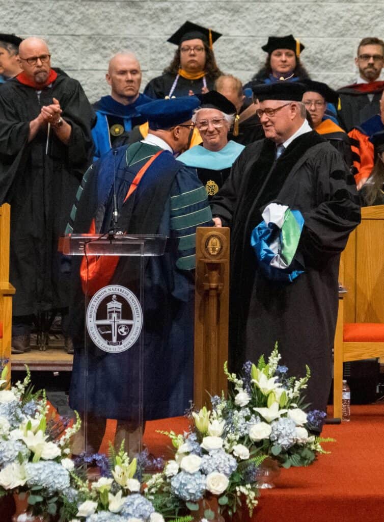 Bishop Edward T. Cook and Mark R. Ramser were honored by Mount Vernon Nazarene University with a Doctor of Divinity and Doctor of Humane Letters degrees, respectively, during the 65th Commencement ceremonies at Mount Vernon Nazarene University on May 3.